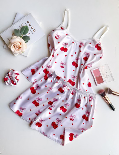 ست تاپ و شورتک ساتن سفید قلب قرمز